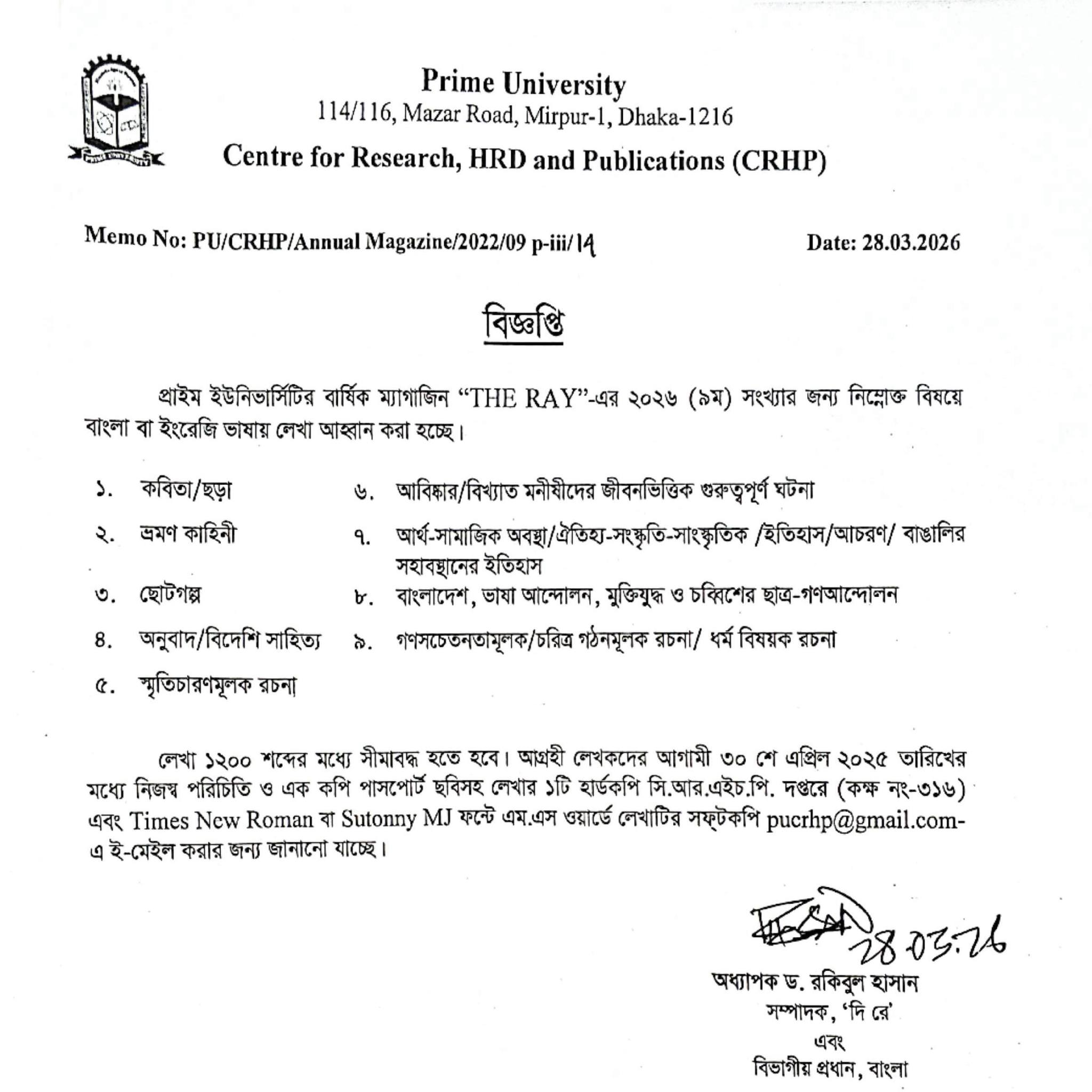 Are you a wordsmith, a storyteller, or a deep thinker? Prime University’s Centre for Research, HRD and Publications (CRHP) has officially announced a call for submissions for the 1st issue of the 2026 annual magazine, "THE RAY." This is a golden opportunity for students and faculty members to showcase their literary talents and academic insights. Whether you prefer writing in Bengali or English, the editorial board is looking for diverse perspectives across a wide range of topics.