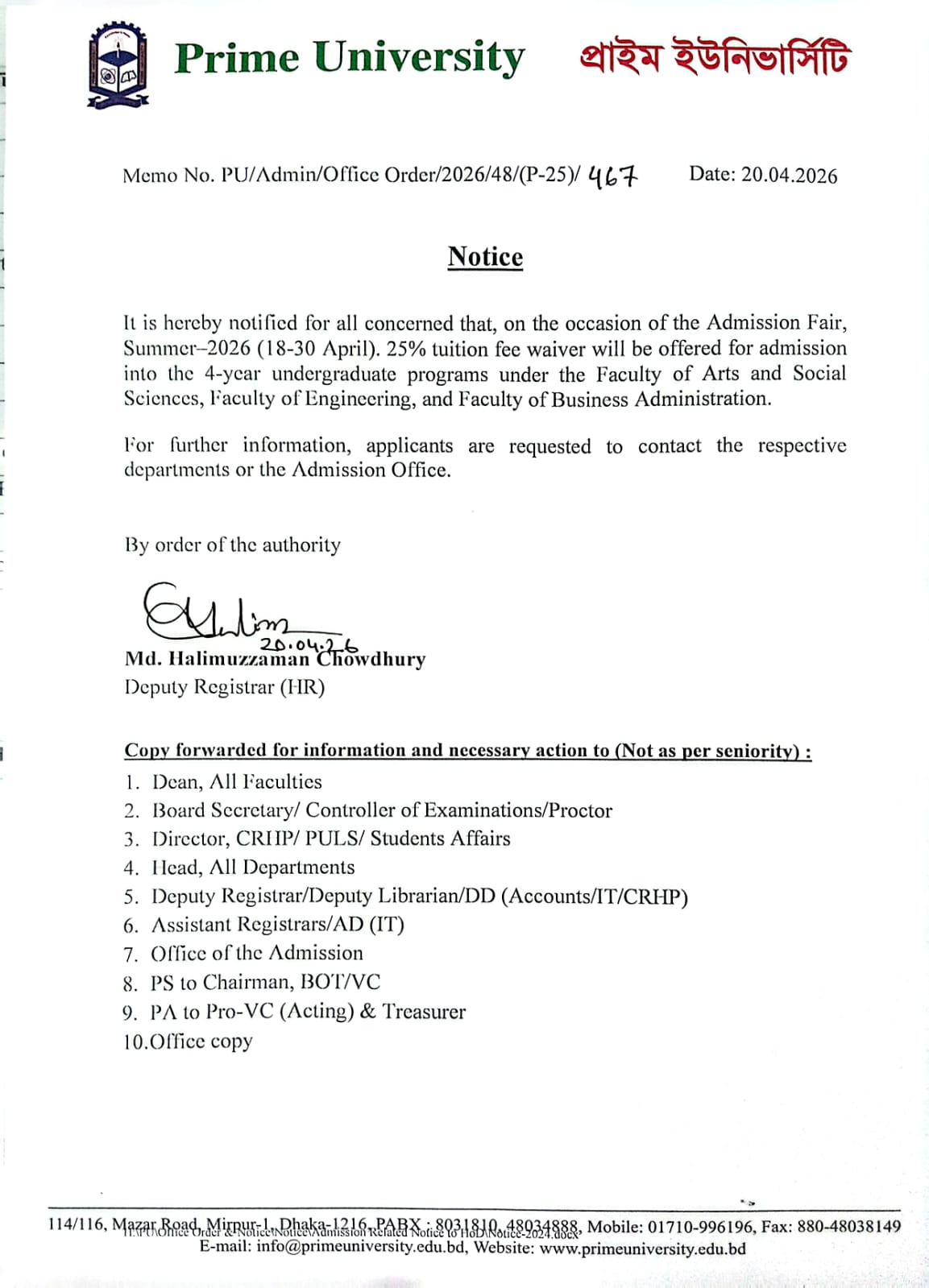It is hereby notified for all concerned that, on the occasion of the Admission Fair, Summer–2026 (18-30 April). 25% tuition fee waiver will be offered for admission into the 4-year undergraduate programs under the Faculty of Arts and Social Sciences, Faculty of Engineering, and Faculty of Business Administration.