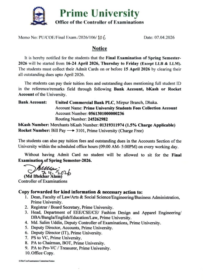 This is to inform all students that the Final Examination of Spring Semester 2026 will be held from 16 April 2026 to 24 April 2026 (Thursday to Friday), except LLB & LLM programs.