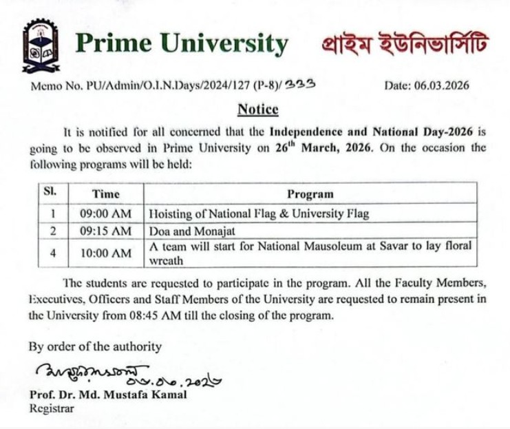 Prime University is proud to announce the observance of Independence and National Day-2026. We invite all students, faculty, and staff to join us in honoring the spirit of our nation with a series of commemorative programs on March 26, 2026.